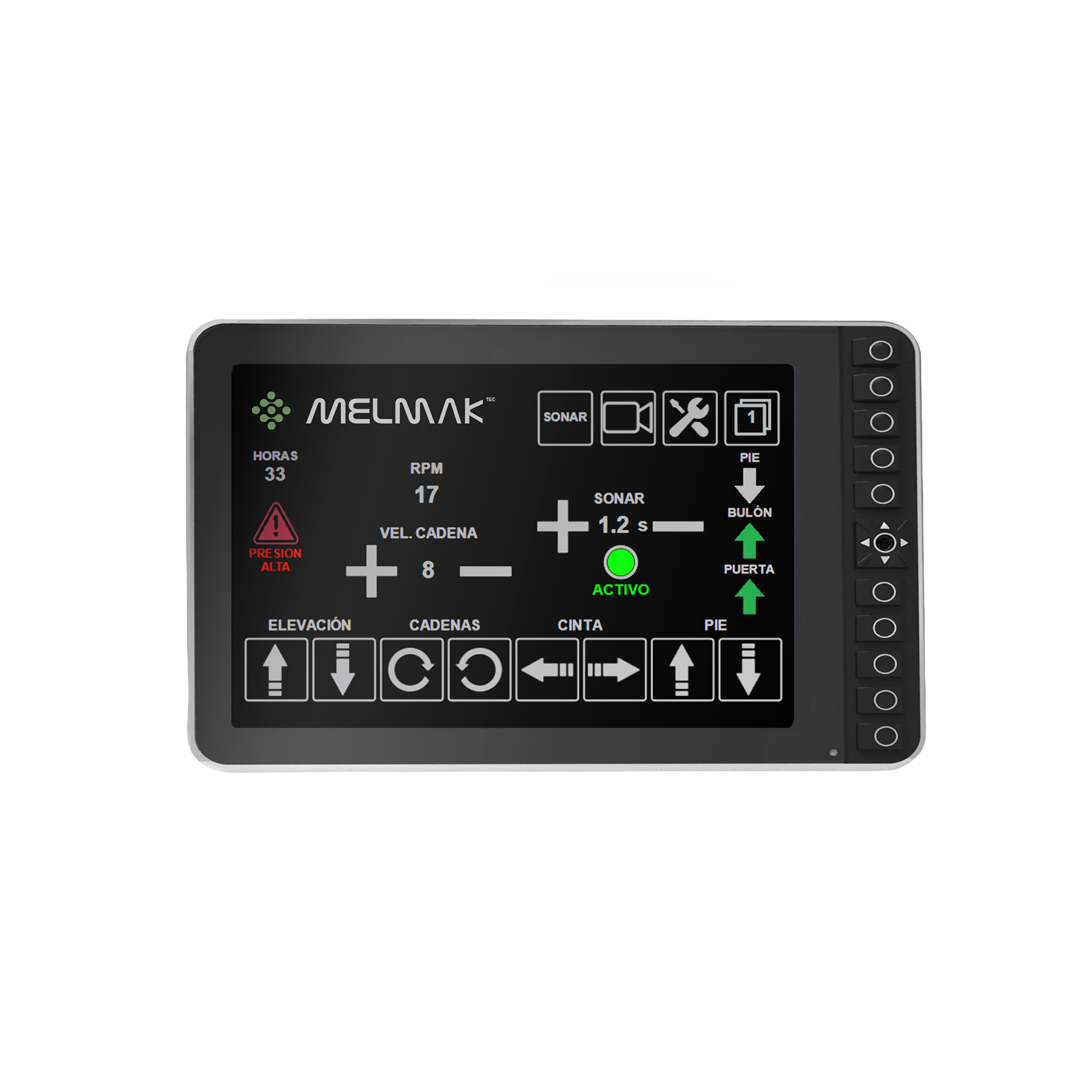 Display táctil de 7” diseñado para operar en condiciones extremas, apto para cabinas interiores y exteriores. Con arranque rápido (<5 s) y carcasa IP65, garantiza un funcionamiento fiable frente a polvo, golpes y vibraciones, en un rango de temperatura de -20 °C a +70 °C. Programable con CODESYS 3.5, ofrece amplias opciones de comunicación y E/S, doble CAN Bus, entradas de vídeo e integración con cámara, además de 11 botones físicos retroiluminados para un control seguro y preciso.